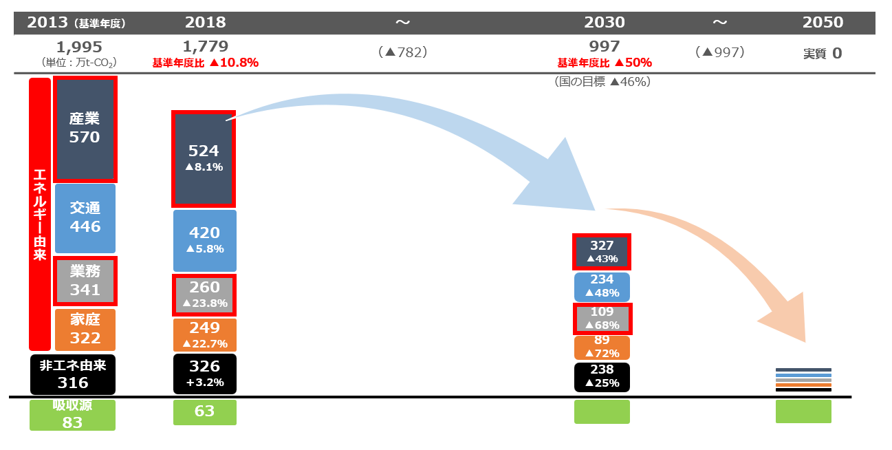 県は、2050年カーボンニュートラル実現に向け、2030年度までに「産業分野」はマイナス43%、「業務分野」はマイナス68%の削減を目指します(いずれも2013年度比)。