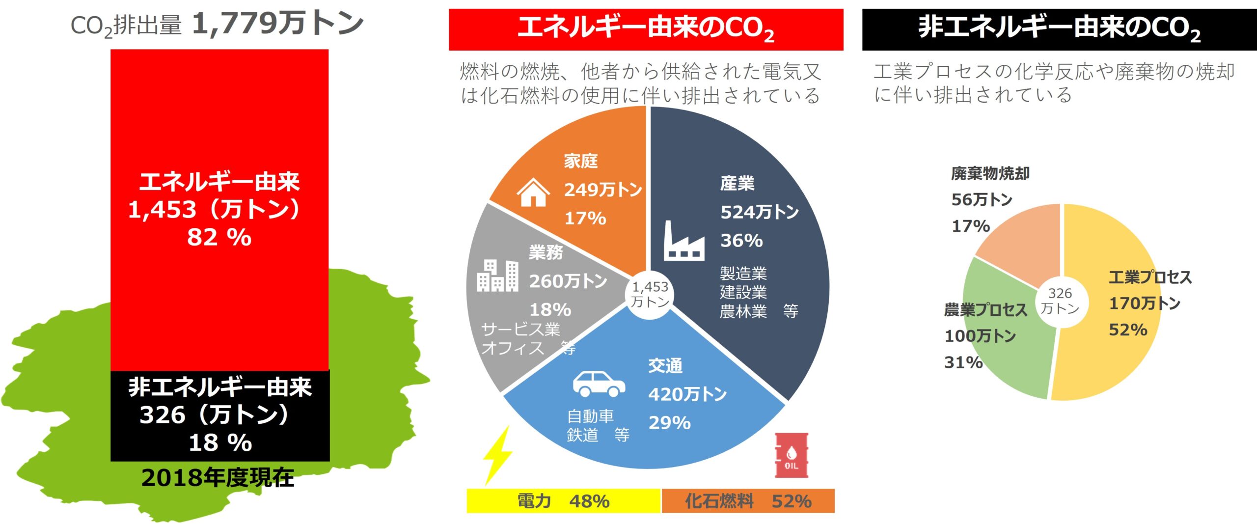 2018年度の栃木県の二酸化炭素排出量は1,779万トンで、電気や化石燃料の使用に伴う「エネルギー由来」の排出が全体の82%、工業プロセスや廃棄物の焼却等に伴う「非エネルギー由来」の排出が全体の18%を占めています。