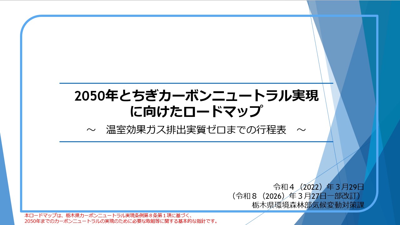 県は、令和2(2020)年12月、「2050年までにカーボンニュートラル(温室効果ガス排出実質ゼロ)実現を目指す」ことを宣言し、その目標達成に向けて必要な取組等を示す「2050年カーボンニュートラル実現に向けたロードマップ(行程表)」を令和4(2022)年3月29日に策定しました。